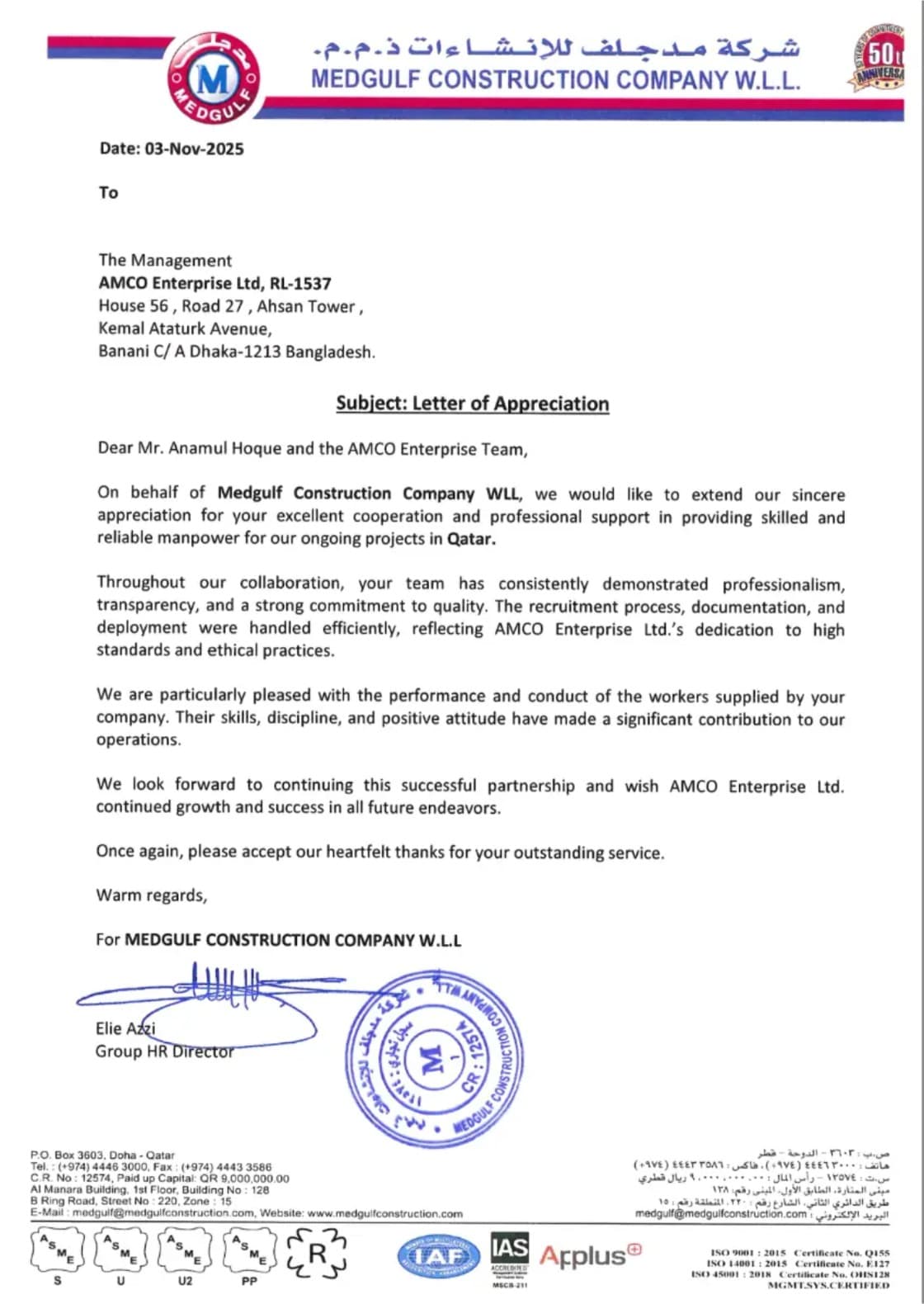 Internationally recognized certificates and credentials of AMCO Enterprise